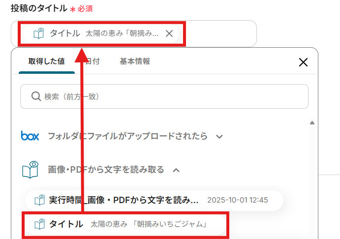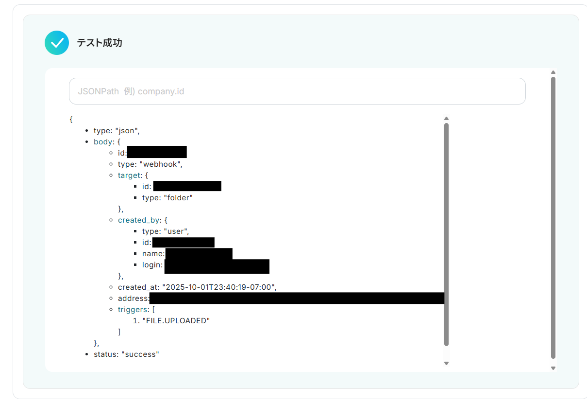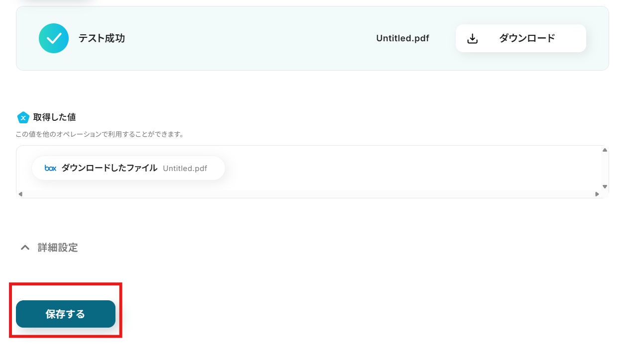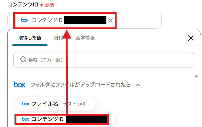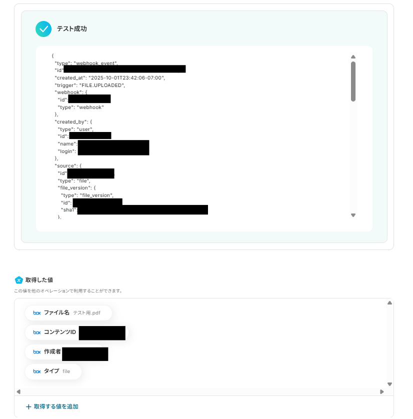 「取得した値」は変数となるので、Boxの指定したフォルダにファイルがアップロードされる度に、そのファイル情報を活用可能になります!