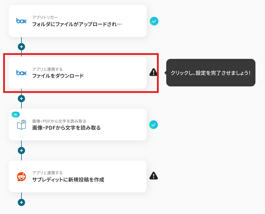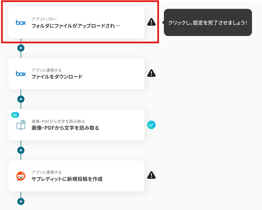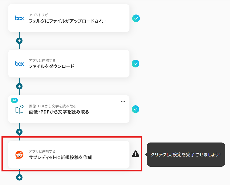 Box内の特定のフォルダにファイルが格納された場合や、ファイル名に特定のキーワードが含まれる場合のみをトリガーとして、OCRでテキストを抽出した上でRedditに投稿する自動化です。