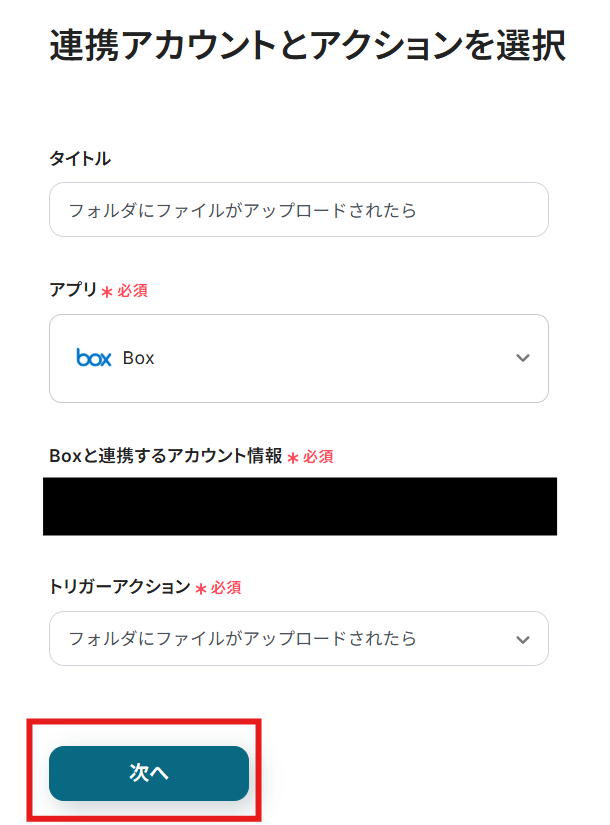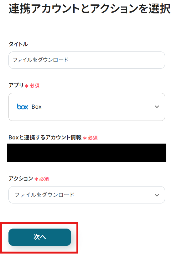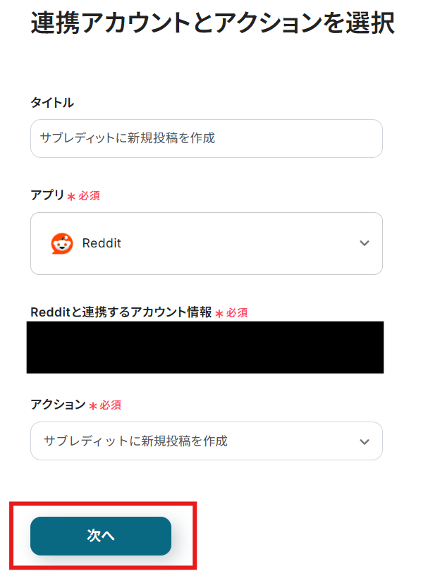 タイトルと連携するアカウント情報を確認し、アクションはテンプレート通りのまま「次へ」をクリックして進んでください。