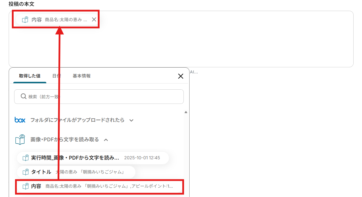「取得した値」は変数となるので、OCRで画像・PDFから文字を読み取る度にそのデータを活用可能になります!