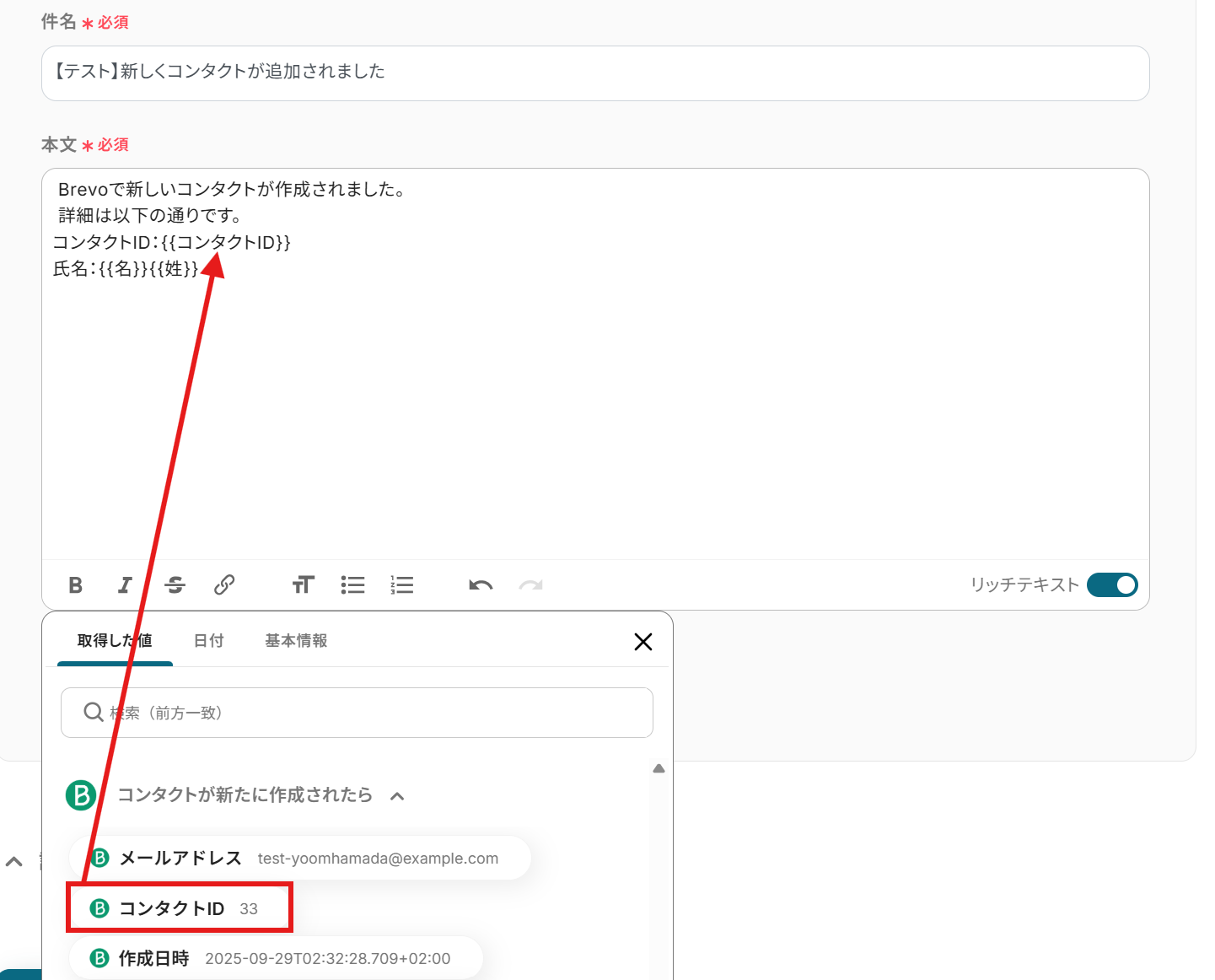 件名・本文:編集欄をクリックすると、Brevoで取得した情報を引用できます。メッセージ作成の際にはぜひ活用してみてください。