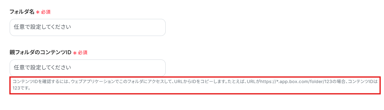 「親フォルダのコンテンツID」は、入力欄下の説明に従って、入力してください。