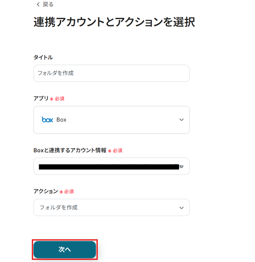 連携するアカウント情報には、ステップ1で連携したアカウント情報が反映されています。トリガーアクションはそのままにして、「次へ」をクリックしてください。