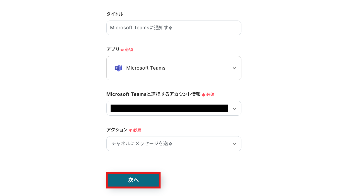 アクションに「チャネルにメッセージを送る」を選んだら、「次へ」をクリックします。