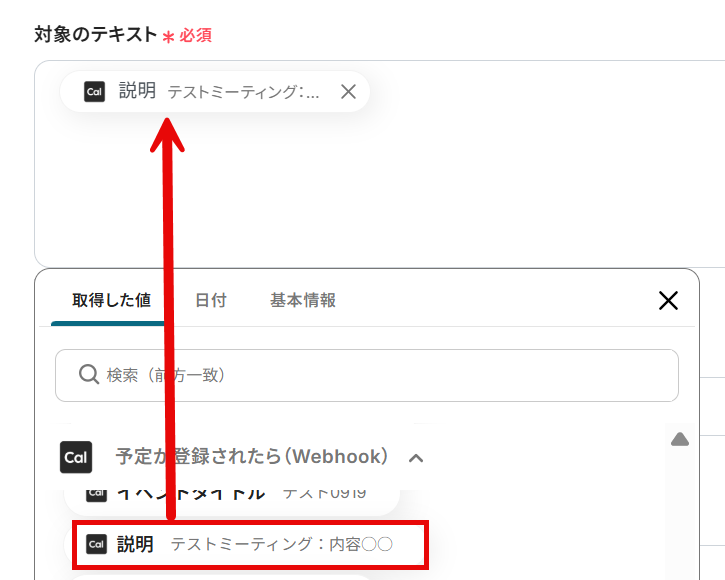 対象のテキストに、前項で取得した値から「説明」を選択します。