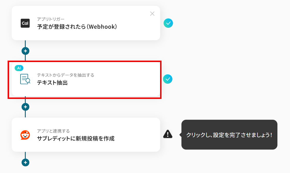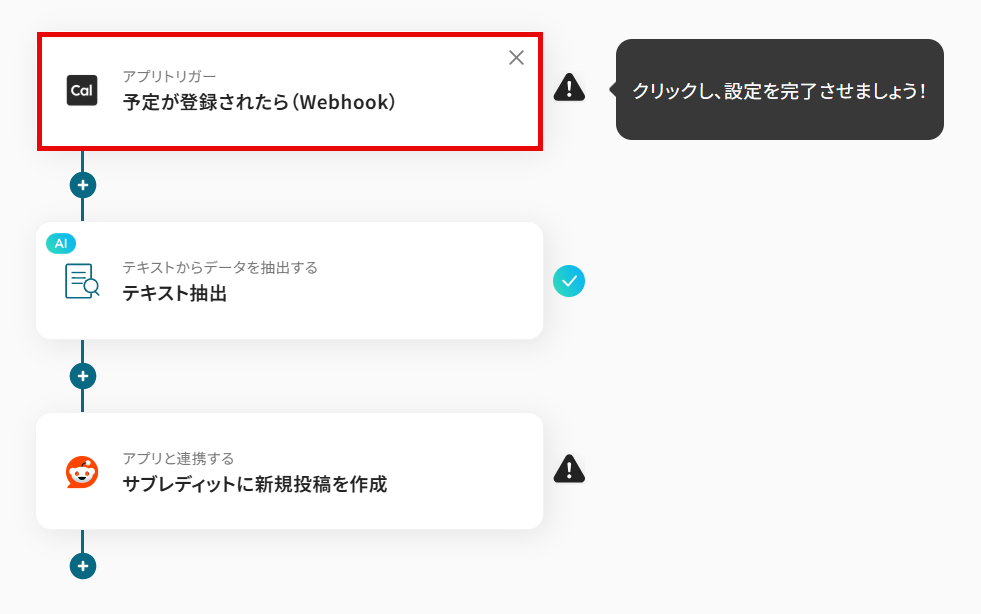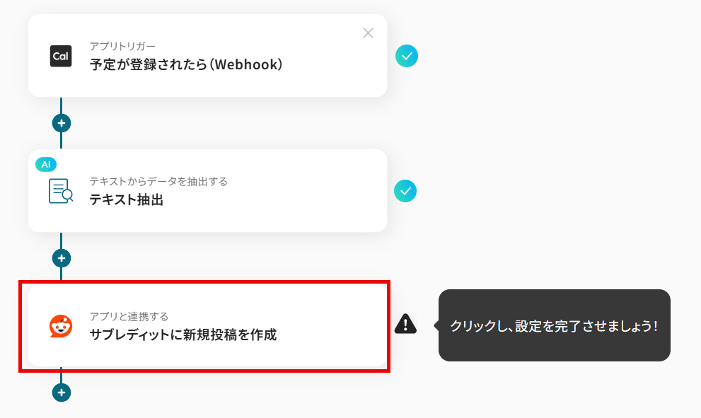 - Cal.comのトリガー設定、テキストの抽出設定およびRedditのアクション設定