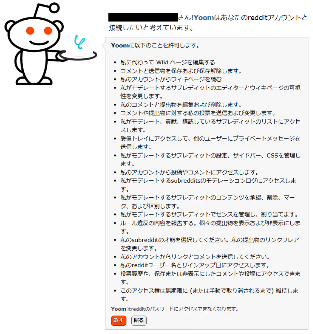 以下の画面から「許す」をクリックし、Redditのアプリ連携は完了です!