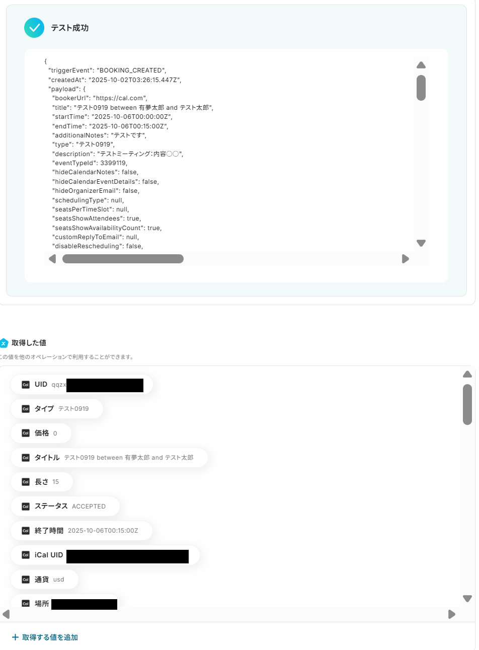 - トリガーアクション:Cal.comに予定が登録されたら起動します。