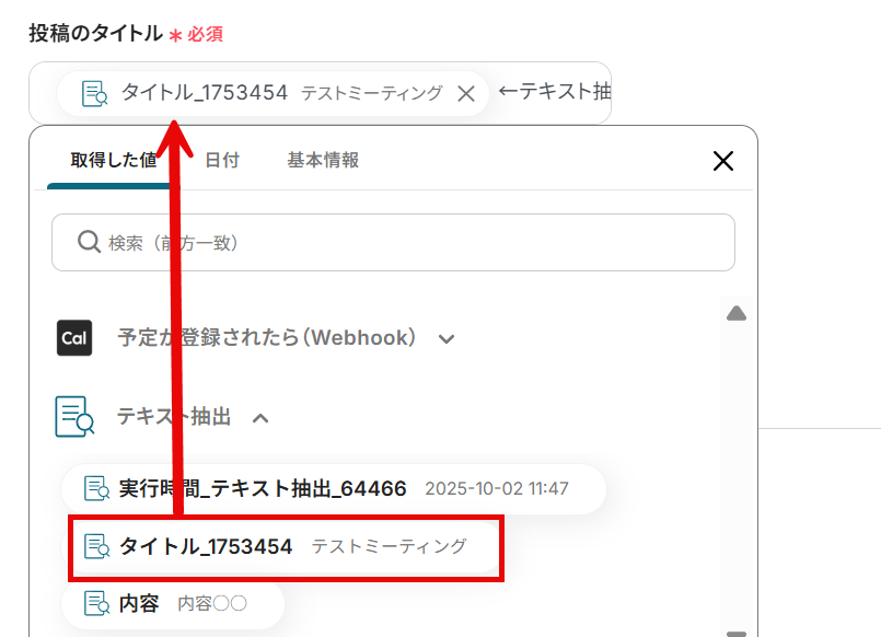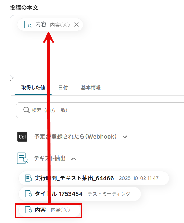 前項で取得した値のテキストから、データを抽出する設定をしましょう。