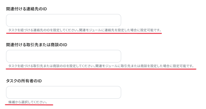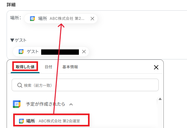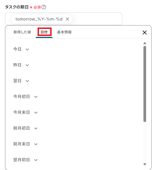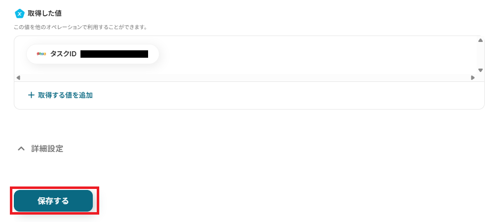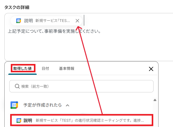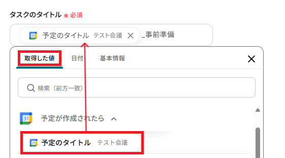 「タスクのタイトル」は、取得した値を活用し設定しましょう。