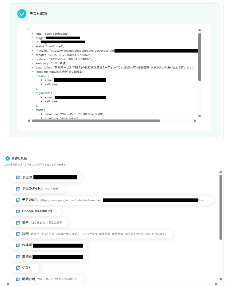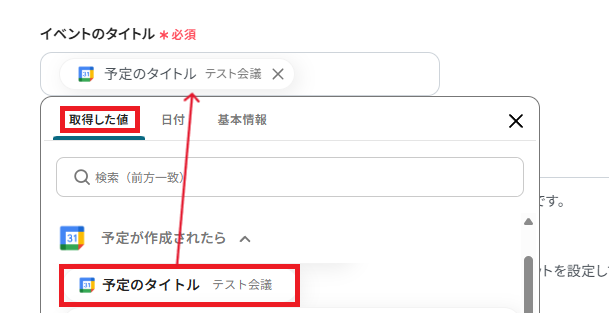 「イベントのタイトル」は、取得した値を活用し設定しましょう。