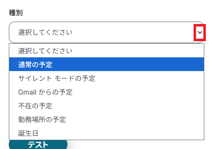 「種別」には、検知対象の予定が管理されているカレンダーの種別をプルダウンから選択してください。