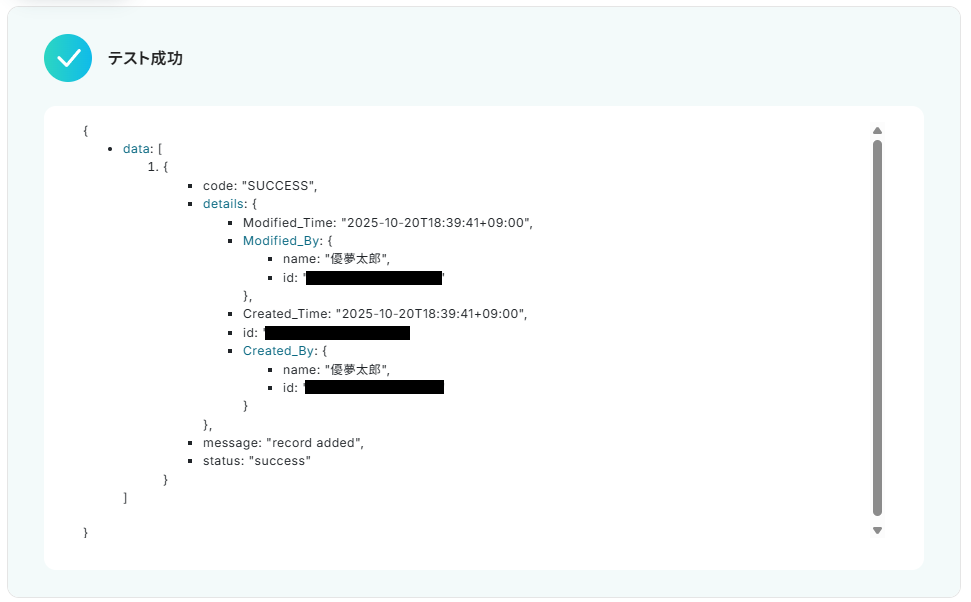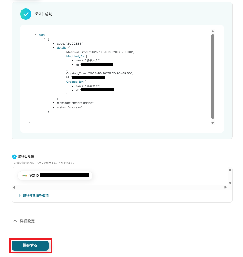 確認できたら、Yoomに戻り「保存する」を押してください。