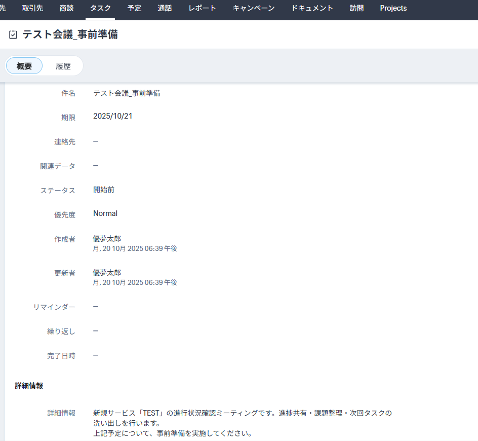 また、実際にタスクが作成されるので、Zoho CRMのタスクを確認してみましょう。