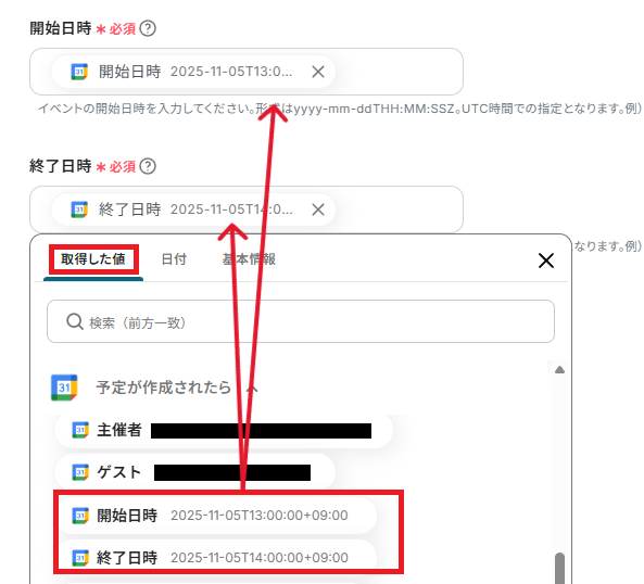「開始日時」と「終了日時」は、取得した値から設定可能です。