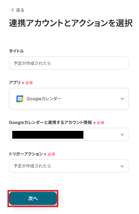 Googleカレンダーと連携するアカウントに間違いがないかを確認し、「次へ」をクリックしましょう。