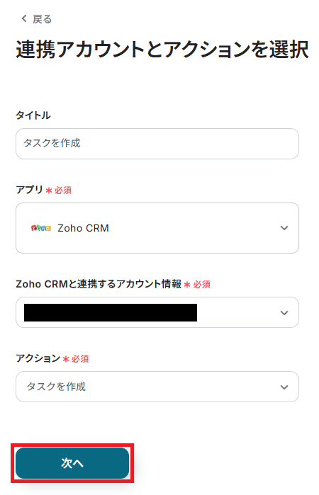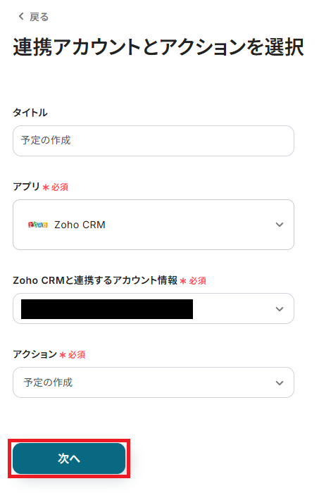 再度、Zoho CRMと連携するアカウントに間違いがないかを確認し、「次へ」をクリックしましょう。