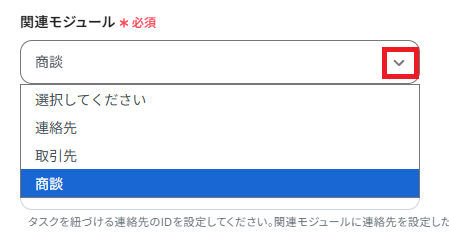 「関連モジュール」は、タスクを紐づけるモジュールをプルダウンから選択してください。