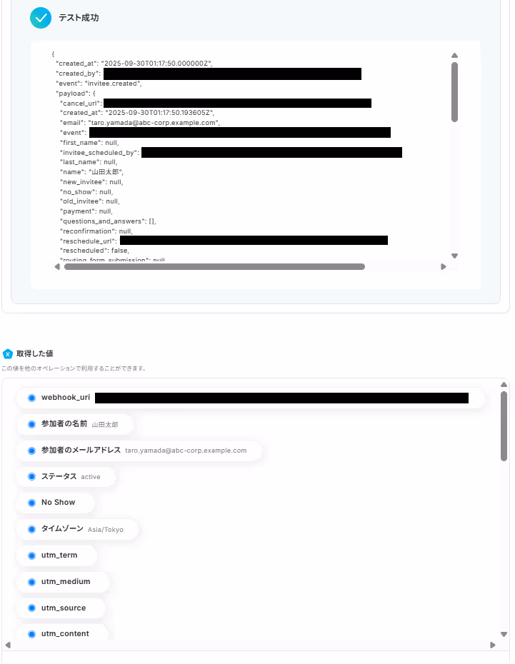 テストに成功すると、下記のような取得した値が表示されます。