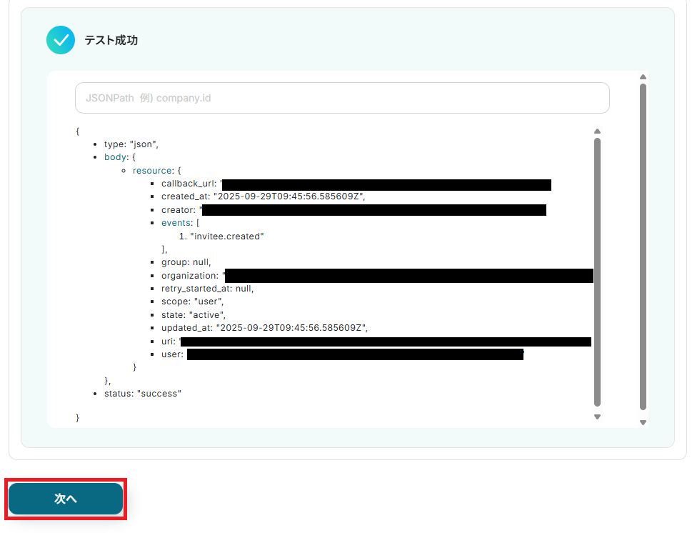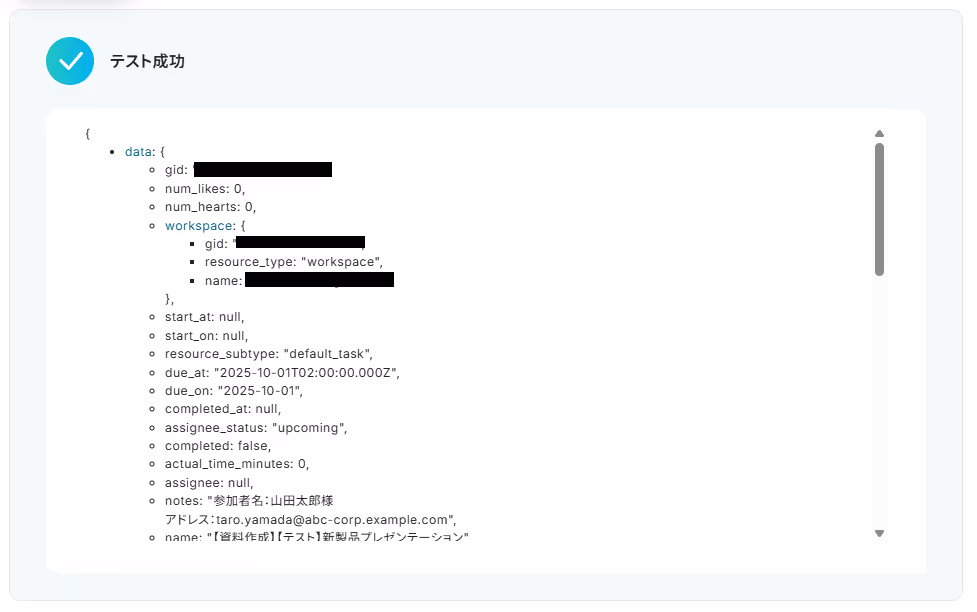 完了したらYoomに戻り「テスト」を実行します。