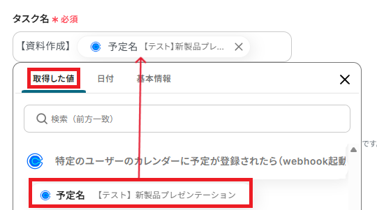「タスク名」は、取得した値から予定名を設定しましょう。