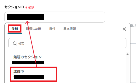 「セクションID」も、候補から設定可能です。