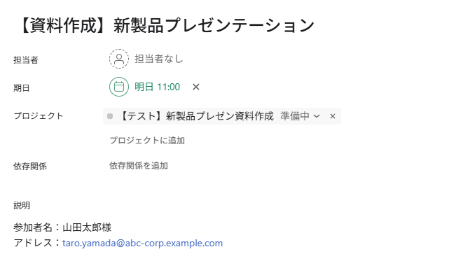 この連携を活用することで、すべての予定をタスク化するのではなく、対応が必要な重要な予定だけをフィルタリングしてタスク管理できるため、より効率的なプロジェクト進行が可能になります。