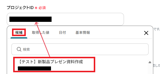 「プロジェクトID」は、入力欄をクリックして表示される候補から選択してください。