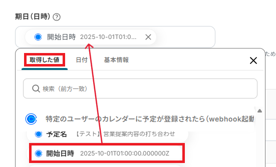 「期日(日時)」も、取得した値から選択可能です。