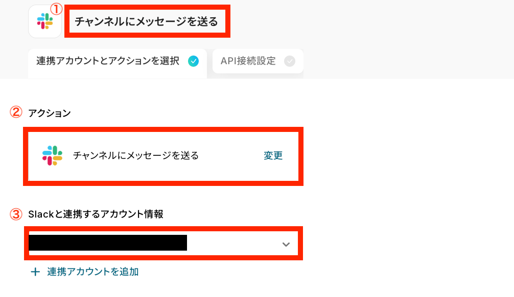 ステップ4:Slackのアクション設定 「チャンネルにメッセージを送る」をクリックします。