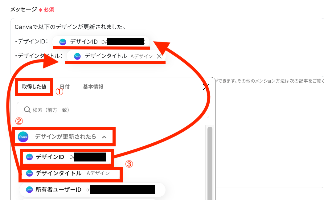 【取得した値の埋め込み方法】 ①入力欄をクリックして「取得した値」を表示 ②「デザインが更新されたら」をクリック ③「デザインID」など埋め込みたい項目を選択