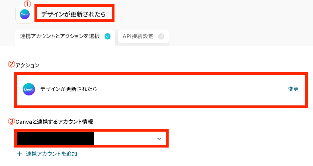 ②アクション:デフォルトで「デザインが更新されたら」が選択されているのでそのままでOK! ③Canvaと連携するアカウント情報:ステップ1で連携したアカウントが表示されていることを確認しましょう。