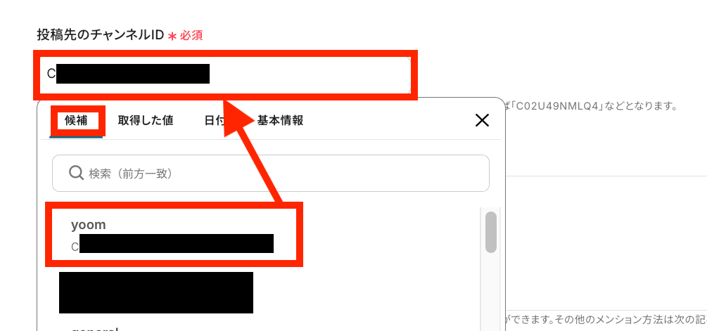 「投稿先のチャンネルID」を設定します。 入力欄をクリックすると、候補一覧が表示されるので、通知先のチャンネルを選んでください!