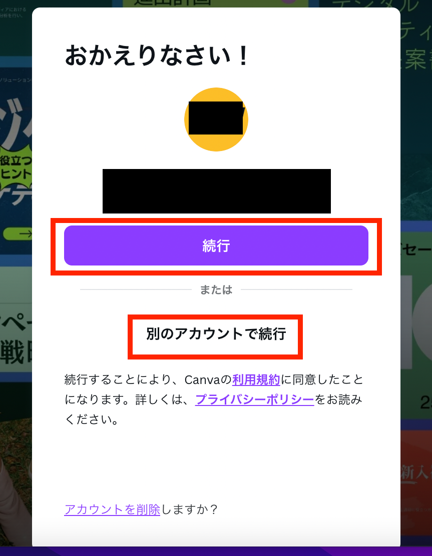 CanvaとYoomの連携方法 Canvaを検索するとアカウントが表示されるので「続行」もしくは「別のアカウントで続行」を選びましょう。