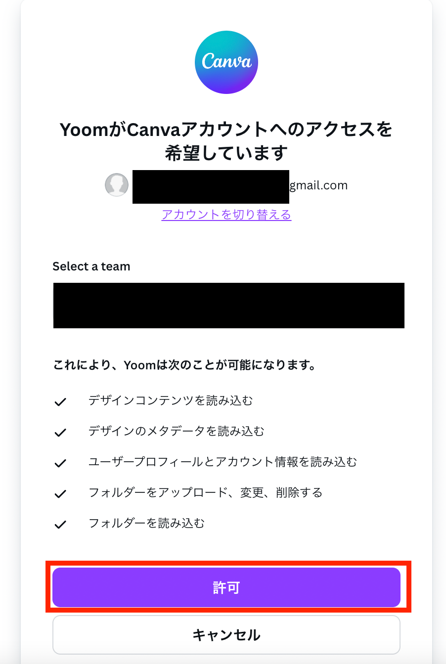 Yoomのアクセス権限のページが表示されるので内容を確認後「許可」をクリックします。 これでCanvaは連携完了です!
