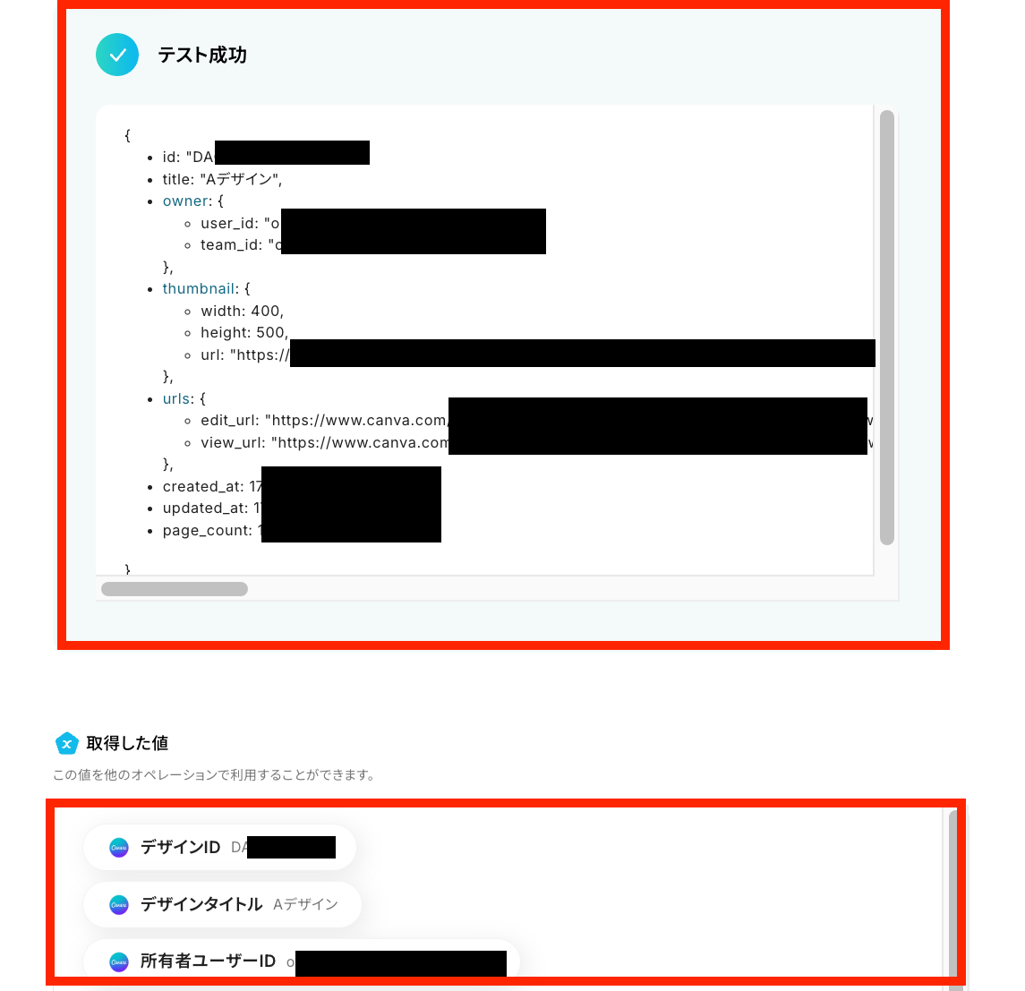 設定が完了したら「テスト」をクリックします。 テストに成功すると、先ほどテスト用に更新したCanvaの画像データが反映されるので、確認できたら「完了」をクリックしてください。 「取得した値」の表示された項目は今後の設定時に使用していきます! 詳しくはアウトプットについて をご参照ください。