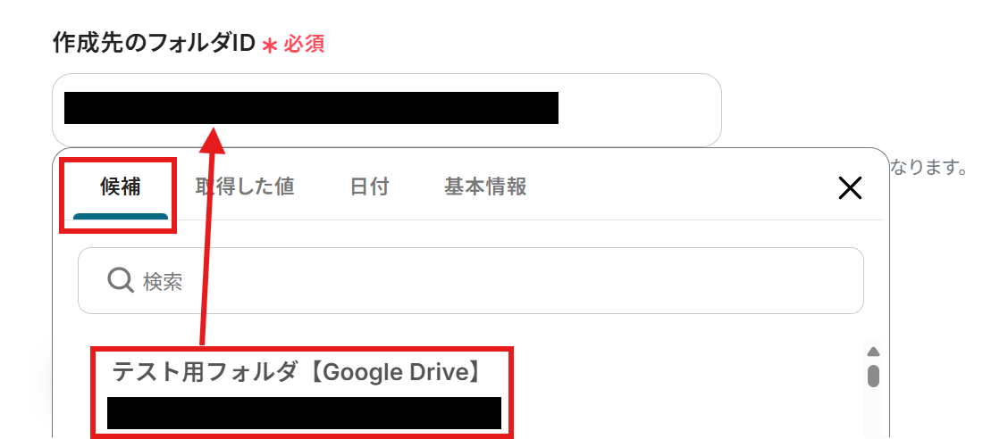 ※全て手入力してしまうと、同じフォルダが何度もGoogle Driveに作成されてしまうので、取得した値から引用するようにしましょう。