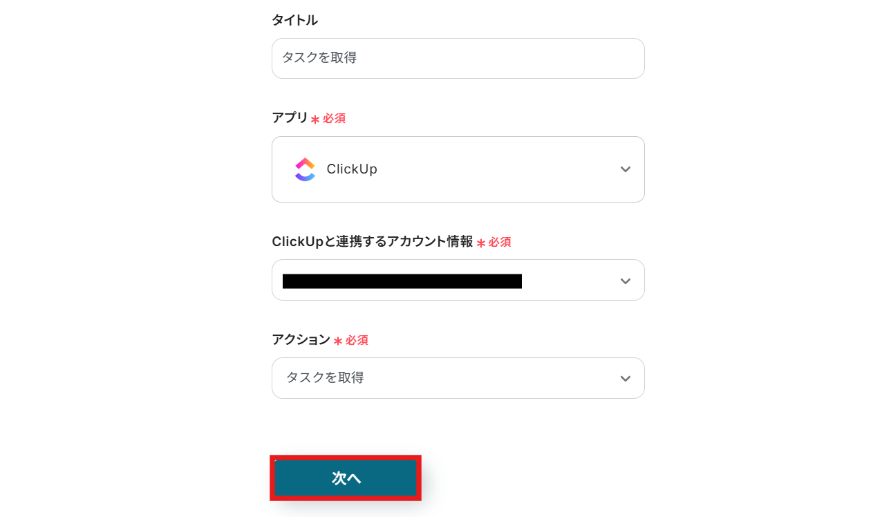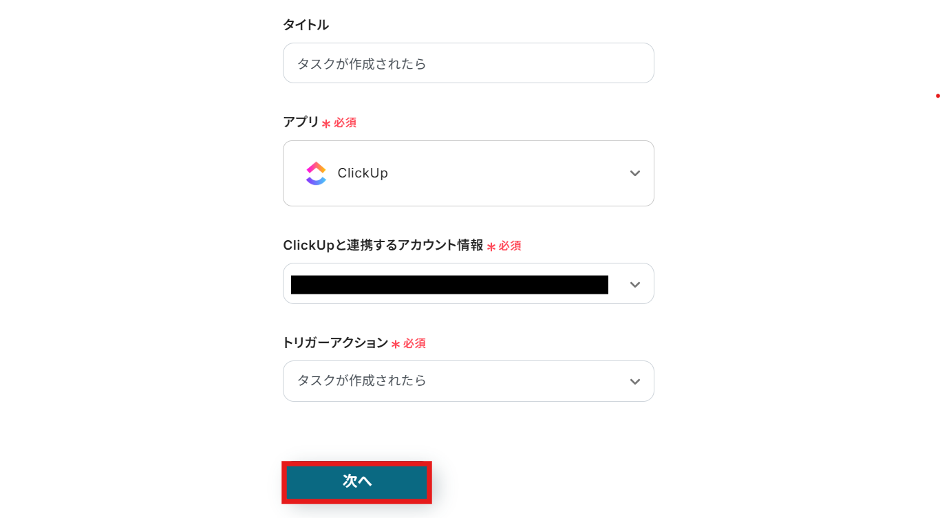 ClickUpと連携するアカウント情報はプルダウンから選択します。