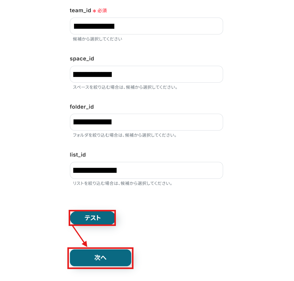 ※team_idから設定しないと他の項目の候補が表示されないため、team_id→space_id→folder_id→list_idの順に設定するようにしましょう。