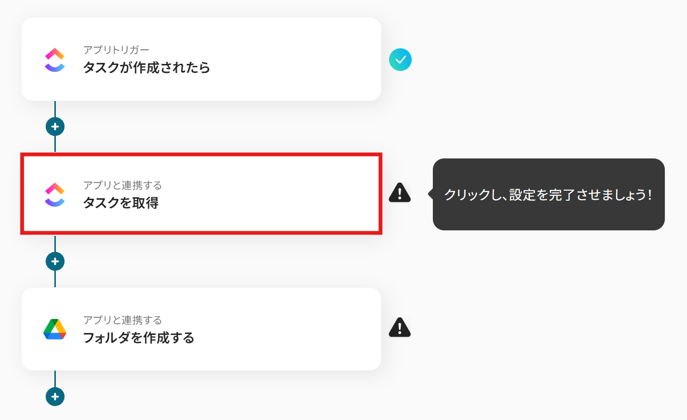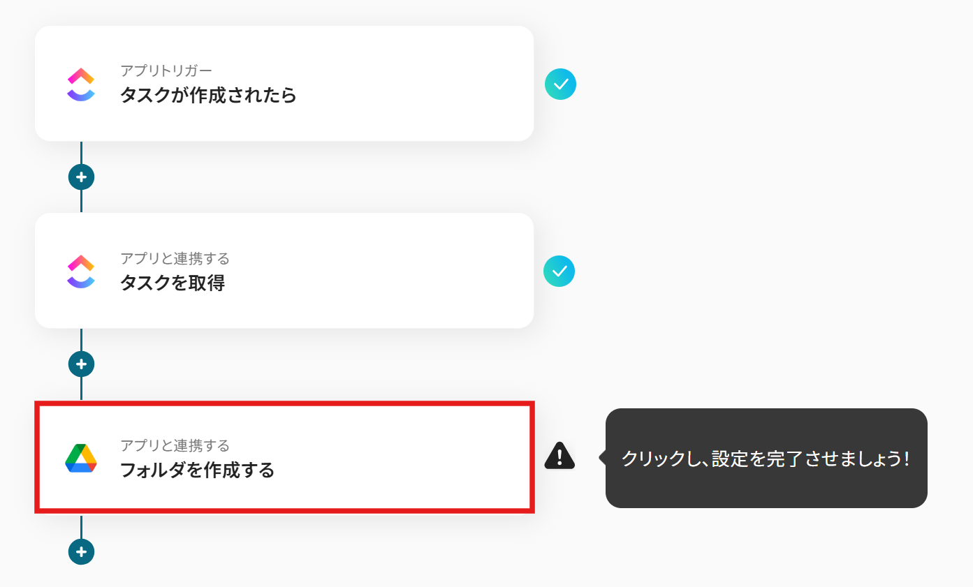 この自動化は、ClickUpでのタスク作成を直接Google Driveへ連携するシンプルな構成のため、設定も簡単です。