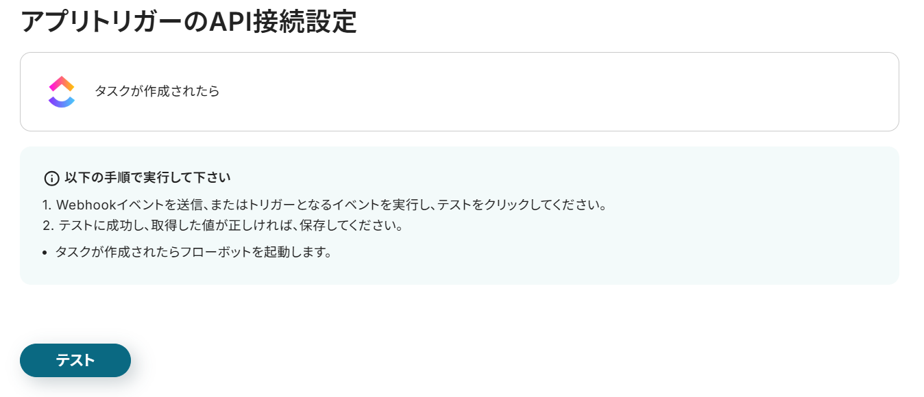 タスクの作成が終わったら、Yoomに戻ってテストをクリックしましょう。