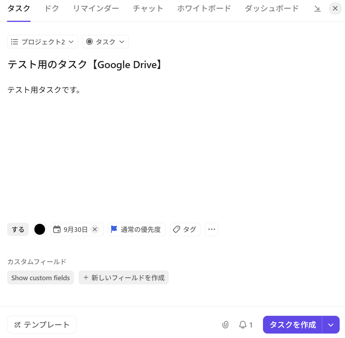 テストをクリックする前に、ClickUpの画面でタスクを作成します。