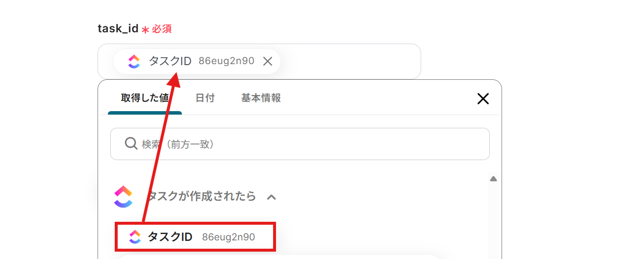 入力欄をクリックすると、取得した値から先ほど作成したタスクIDを引用できます。