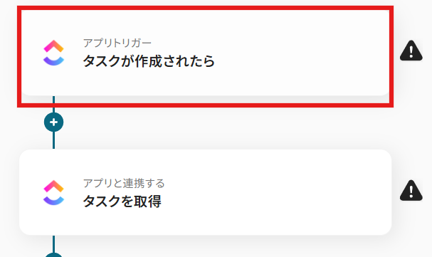 - 次に、トリガーでClickUpを選択し、「タスクが作成されたら」というアクションを設定します