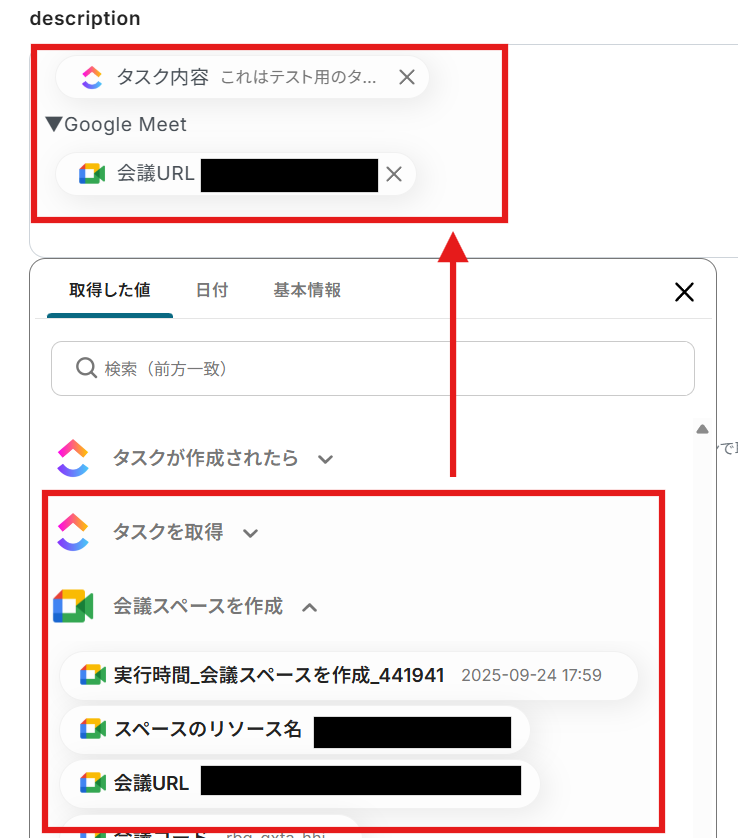 - ClickUpの「タスクを更新」オペレーションでは、Google Meetで作成した会議URLなど、前段のフローで取得した情報をタスクの任意の項目に設定することが可能です。