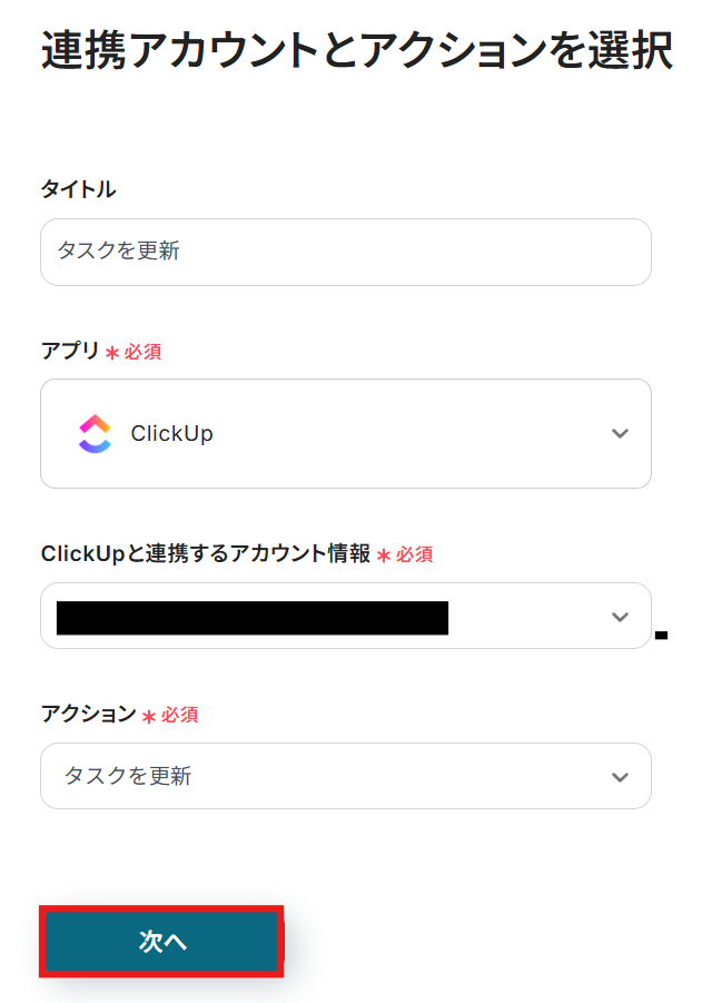 - ClickUpの「タスクを更新」アクションでは、作成したGoogle MeetのURLをタスクのどの項目に追記するかなどを任意で設定できます
