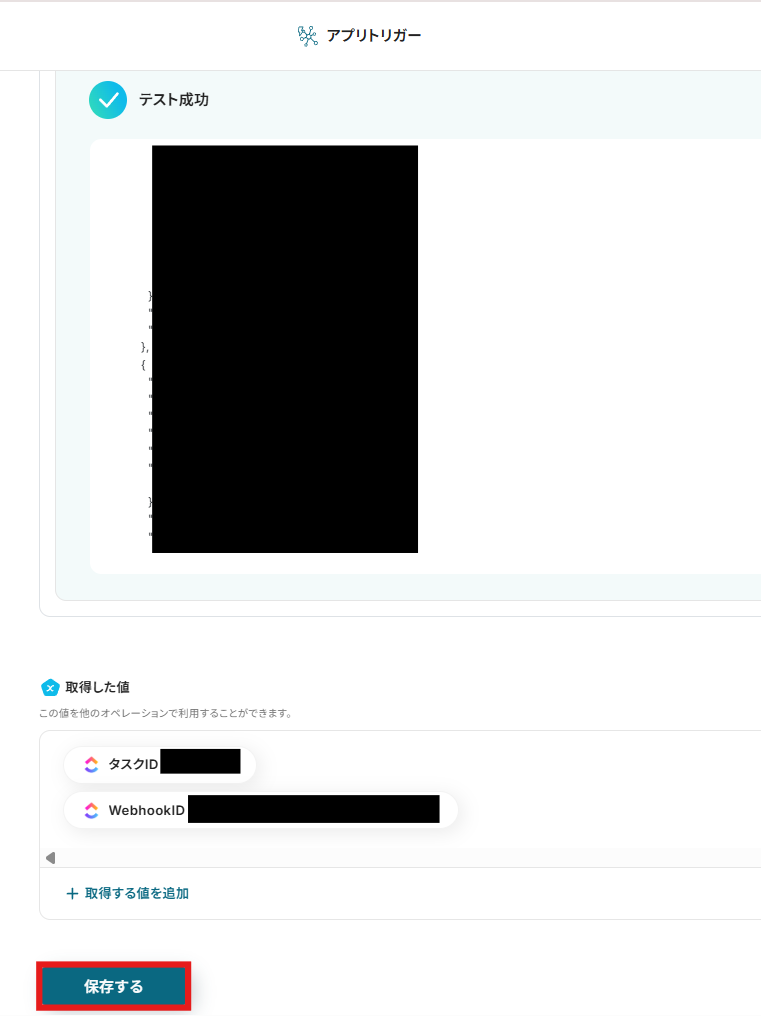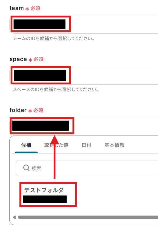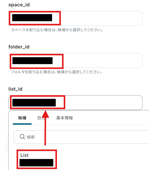 - ClickUpのトリガー設定では、自動化の対象としたいチームID、スペースID、フォルダID、リストIDをそれぞれ任意で設定してください。