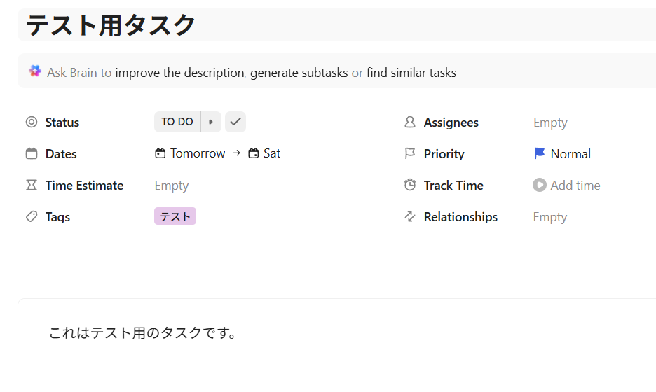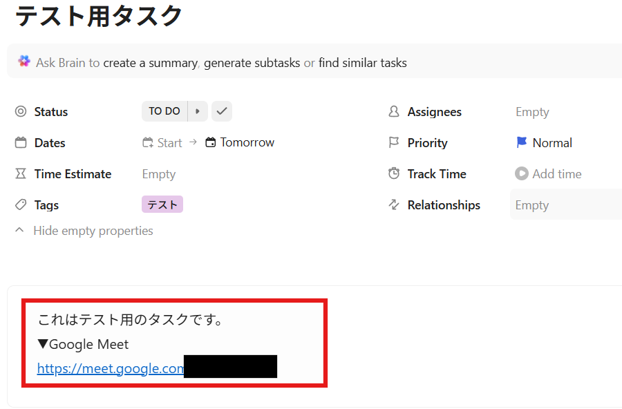 - ClickUpへのタスク作成と同時にGoogle Meetの会議URLが自動で追加されるため、これまで手作業に費やしていた時間を短縮することができます。