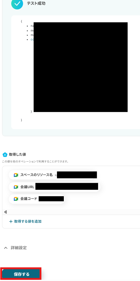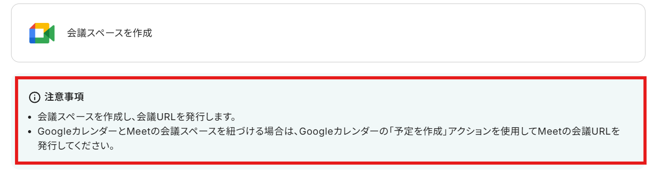 - Google Meetの「会議スペースを作成」では会議URLが発行されます。Googleカレンダーの予定と紐づけたい場合は、代わりにGoogleカレンダーの「予定を作成」アクションをご利用ください。