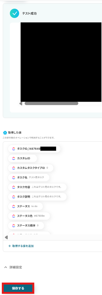「list_id」「task_id」はそれぞれ入力欄をクリックすると表示される「取得した値」の中から選択します。